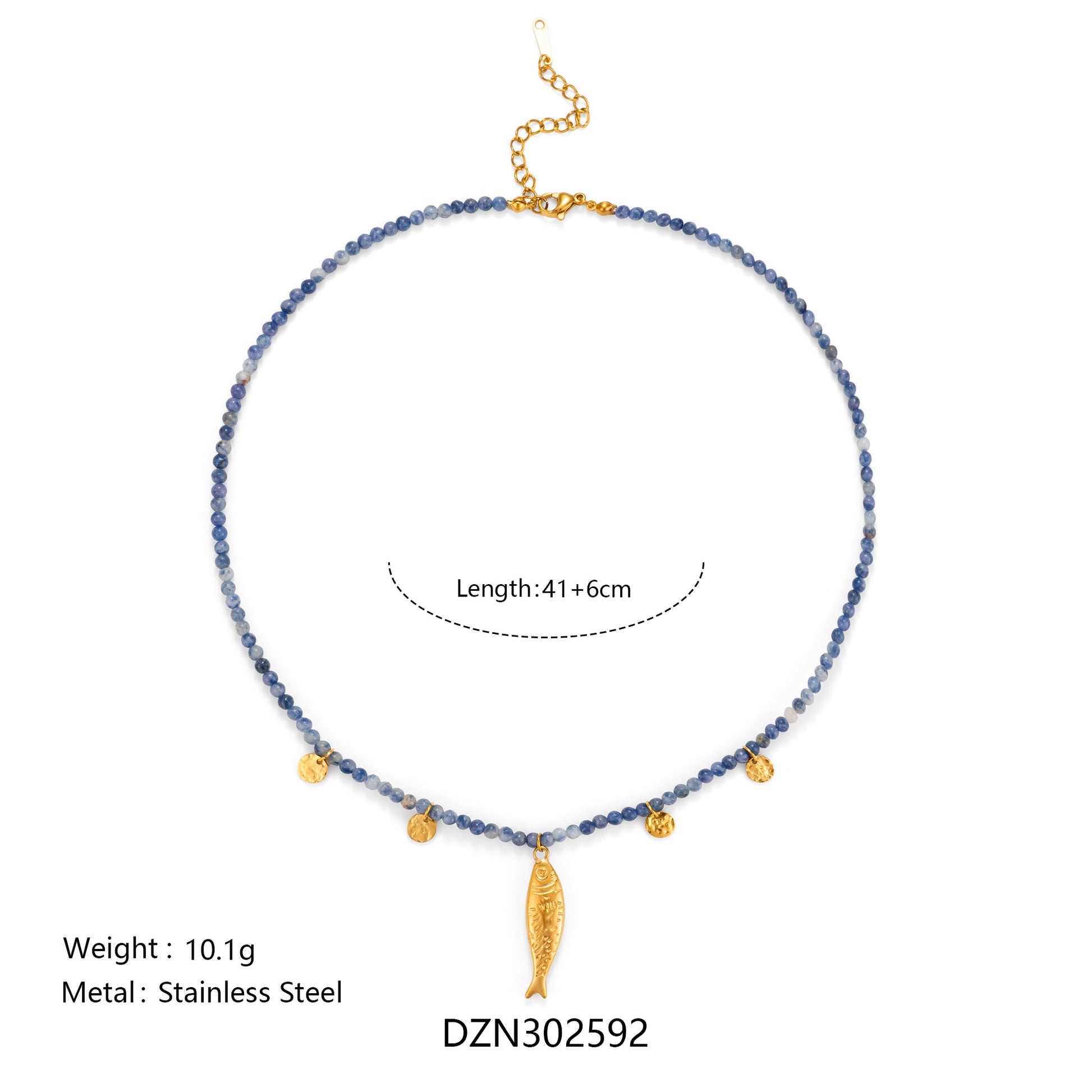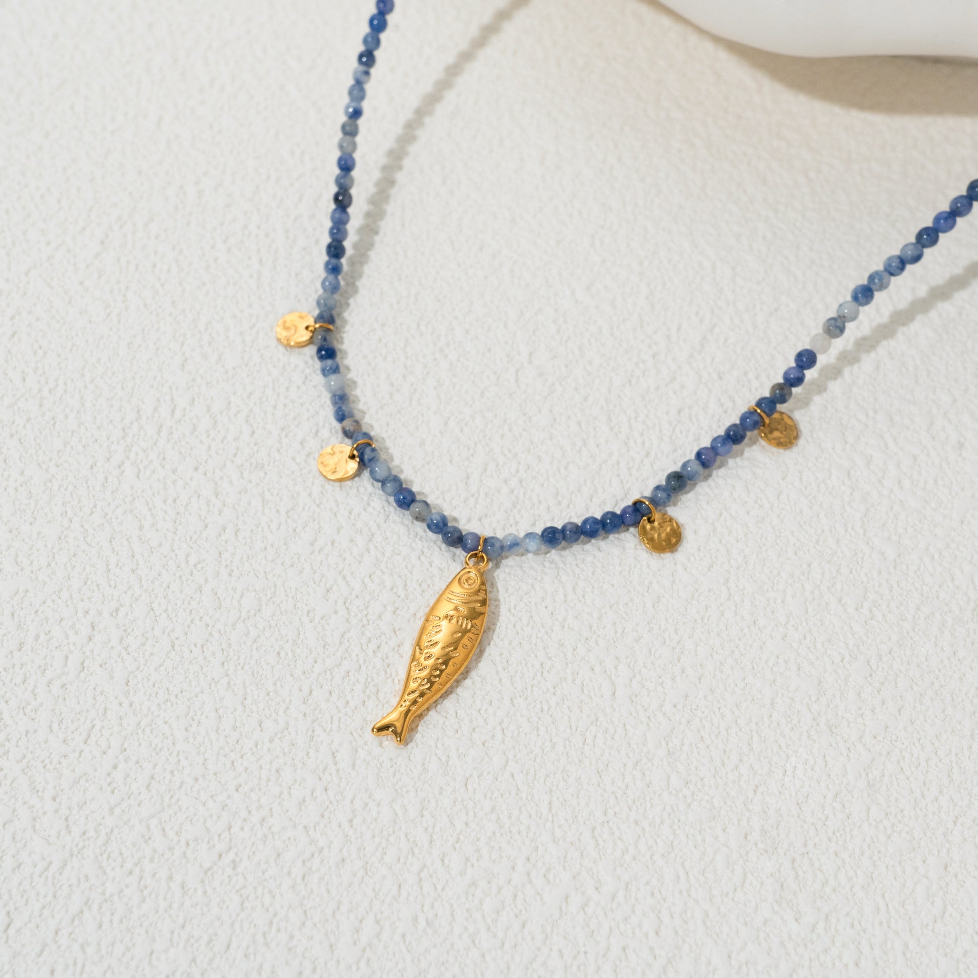 Elevate your everyday style with this stunning handmade necklace, where natural blue stone beads meet artisanal craftsmanship. Featuring a captivating golden fish pendant adorned with delicate chrysanthemum detailing, this boho-inspired piece brings effortless elegance to any outfit. The anti-tarnish chain ensures lasting beauty, while the natural stone beads add authentic texture and character. Perfect for those who appreciate unique, meaningful jewelry that tells a story. Wear it as a statement piece or layer it with other favorites for a personalized look that reflects your individual style.